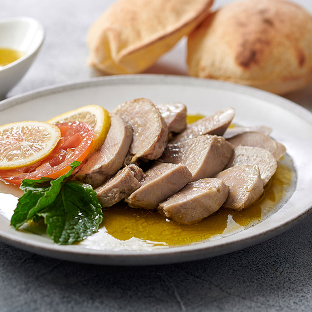 Boiled lamb tongue marinated with garlic, lemon & olive oil