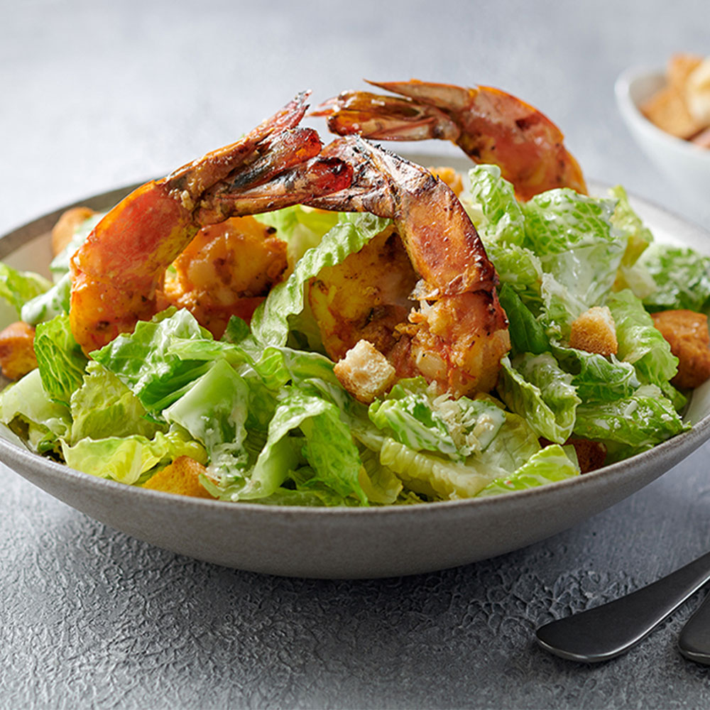 Romaine lettuce, parmesan, grilled shrimps, crouton in Caesar dressing