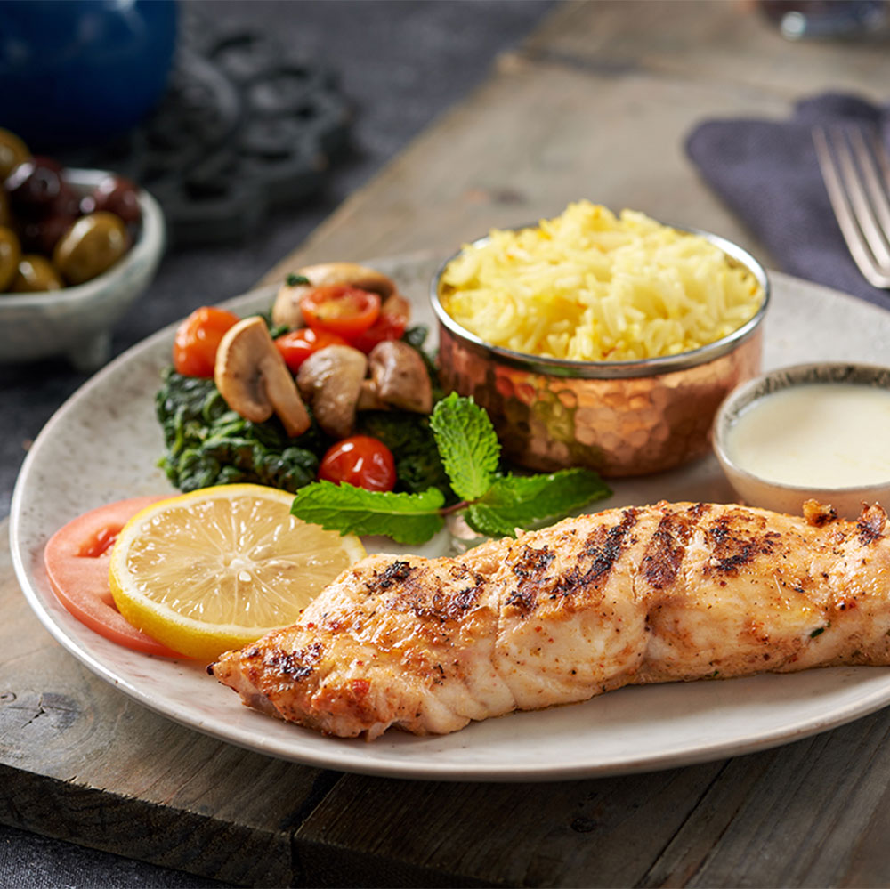 Local hammour fillet, served with saffron rice, sautéed spinach and mushroom
